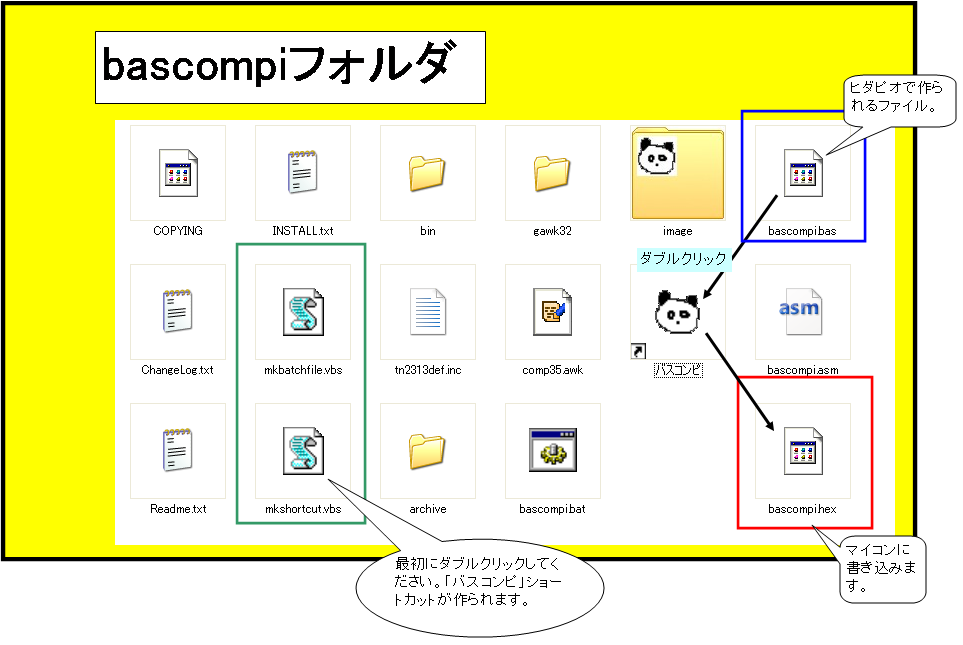 アーカイブを展開すると「bascompi」フォルダが出てくるので、ヒダピオの「bin」フォルダに移動してください。「バスコンピ」ショートカットを作成するために、最初に1度だけ「mkshortcut.vbs」をダブルクリックしてください。