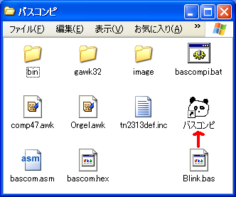 コンパイルの仕方は簡単で、ソースプログラムの名前が「bascompi.bas」なら「バスコンピ」ショートカットをダブルクリックするだけです。それ以外の名前ならば、「バスコンピ」ショートカットにドラッグ&ドロップします。このときは生成するファイル名が「bascom.hex」になるので注意してください。